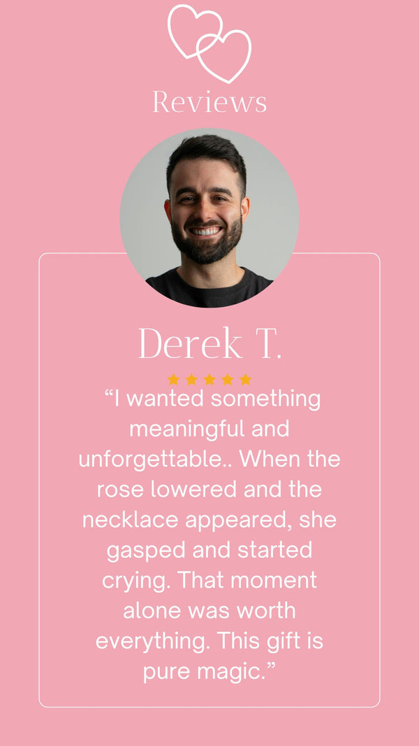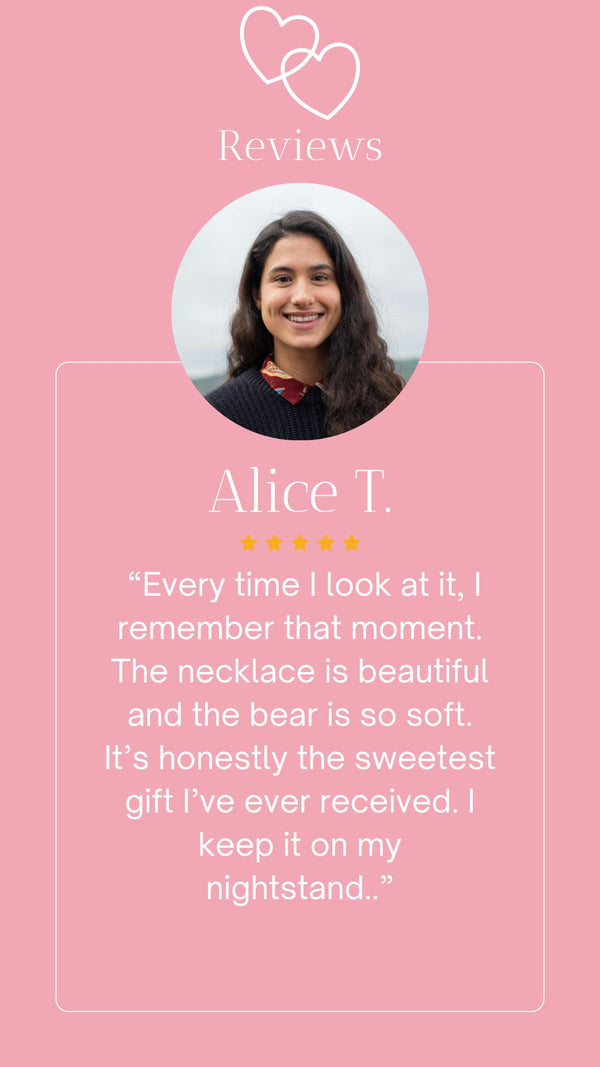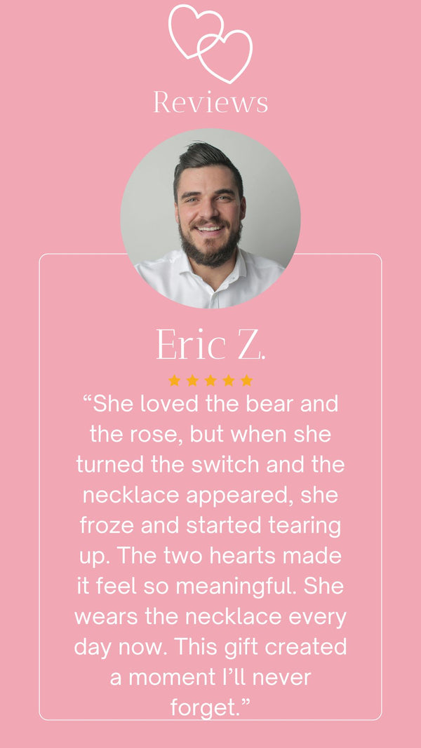 I had no idea there was a necklace hidden inside. Watching the rose disappear and the necklace rise up felt like something out of a movie. It was so thoughtful and full of love. I wear the necklace every day now and keep the bear on my nightstand.